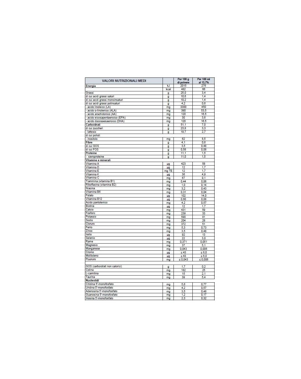 Sieroproteine idrolizzate (da latte), oli vegetali (palma, colza a basso contenuto di acido erucico, girasole, cocco), sciroppo di glucosio, galatto-oligosaccaridi (da latte) in polvere, maltodestrine, amido di patata, amido di mais, lattosio, frutto-oligosaccaridi, olio di pesce, idrogenofosfato di potassio, fosfato di calcio, cloruro di calcio, cloruro di colina, olio estratto da Mortierella alpina, idrogenofosfato di magnesio, cloruro di potassio, cloruro di sodio, acido L-ascorbico, inositolo, taurina, solfato ferroso, L-carnitina, solfato di zinco, uridina 5′-monofosfato sale sodico, acetato di DL-α-tocoferile, citidina 5′-monofosfato, calcio D-pantotenato, adenosina 5′-monofosfato, inosina 5′-monofosfato sale sodico, nicotinamide, guanosina 5′-monofosfato sale sodico, solfato rameico, riboflavina, emulsionante: lecitina di soia, palmitato di retinile, cloridrato di tiammina, cloridrato di piridossina, ioduro di potassio, acido folico, solfato di manganese, selenito di sodio, fitomenadione, colecalciferolo, D-biotina, cianocobalamina.