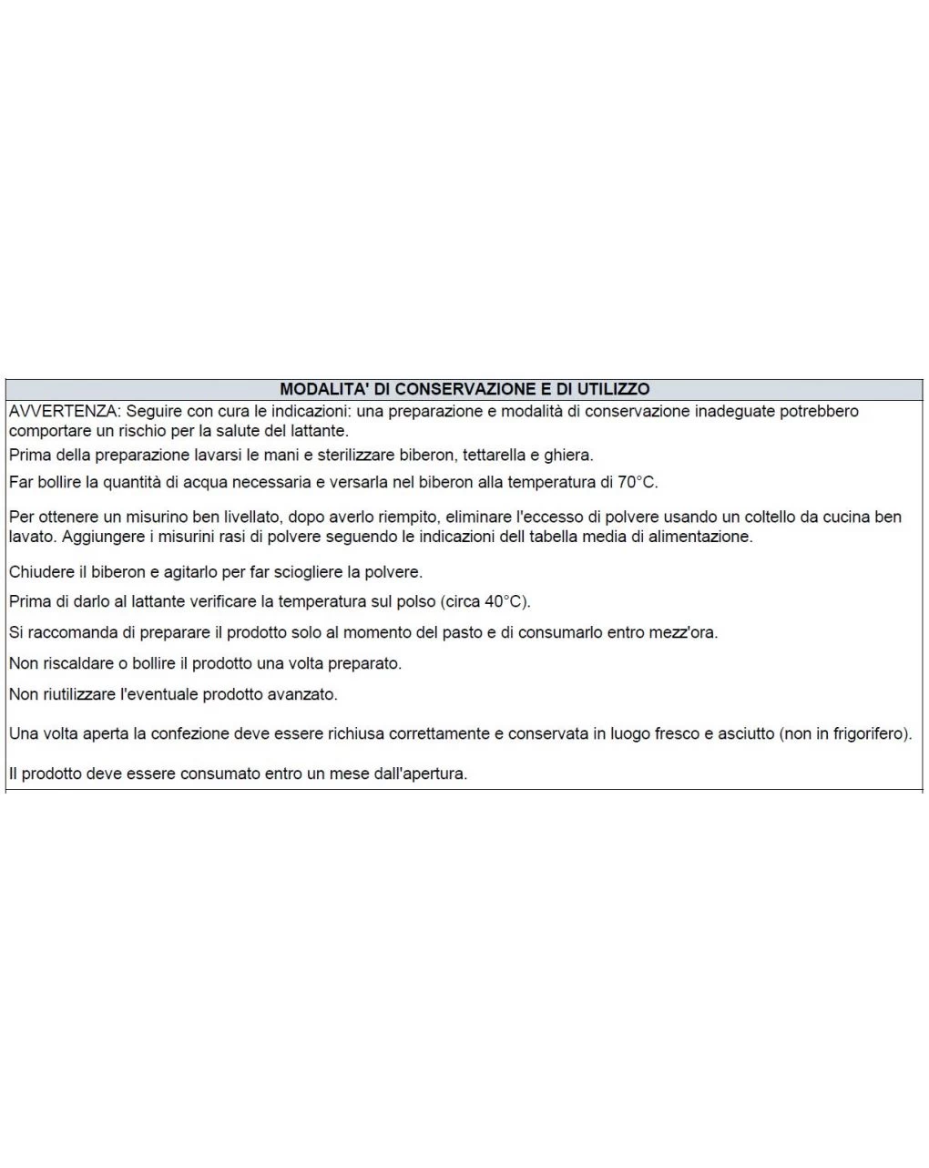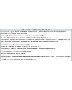 Il prodotto deve essere utilizzato sotto il controllo del Pediatra ed è indicato per lattanti. Il prodotto non deve essere utilizzato come unica fonte di nutrimento nei primi sei mesi di vita. Il prodotto non deve essere utilizzato per via parenterale. Importante: Il latte materno è l’alimento ideale per il lattante. E’ raccomandato come alimento esclusivo fino al sesto mese e come componente lattea di una dieta equilibrata durante lo svezzamento e anche dopo l’anno di vita.