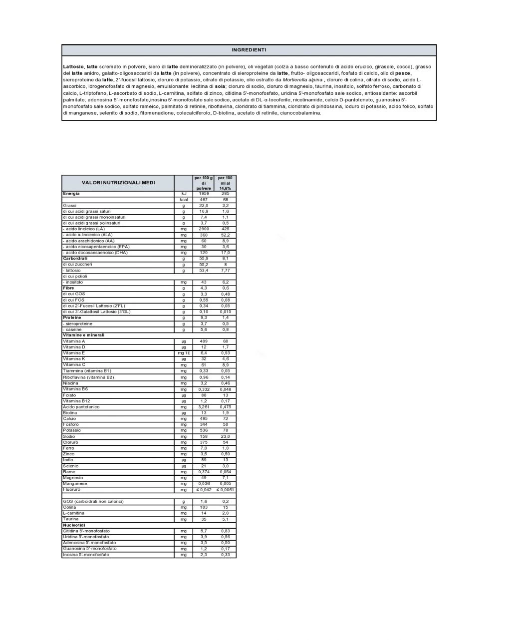 Avvertenze importanti: il latte materno è l’alimento ideale per il lattante ed è raccomandato come alimento esclusivo fino al 6° mese e come componente lattea di una dieta equilibrata durante lo svezzamento e anche dopo l’anno di vita. Se manca o è insufficiente si può utilizzare un latte di proseguimento solo su indicazione del Pediatra. Aptamil Profutura Duobiotik 2 è idoneo per i lattanti solo dopo il compimento del 6° mese, non deve essere utilizzato come sostituto del latte materno nei primi 6 mesi di vita ed è da intendersi come parte di un’alimentazione diversificata. L’inizio dello svezzamento deve avvenire unicamente seguendo le indicazioni del Pediatra.