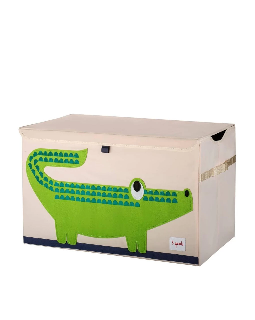 Baule portagiochi dalla simpatica decorazione a forma di coccodrillo in stoffa. Con le sue pareti rinforzate e la notevole capienza è perfetto per riporre libri, peluches e giocattoli. anche se vuoto mantiene la sua forma, arreda e rallegra la cameretta. Dimensioni: 61x37x38cm