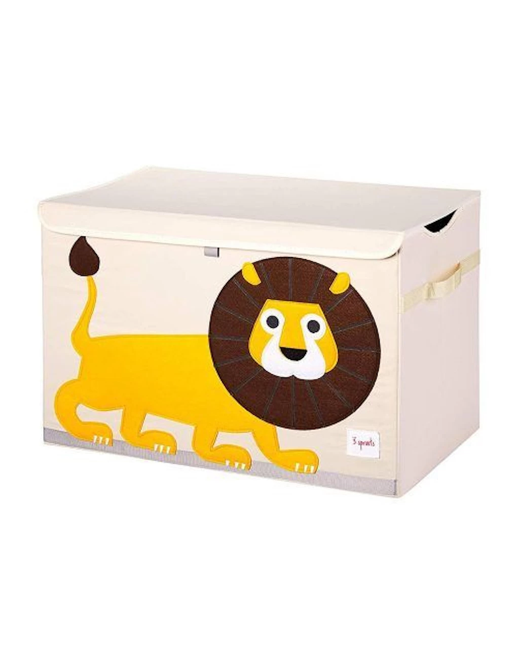 Baule portagiochi con grafica di un leone giallo con criniera marrone. Realizzato in tessuto, dotato di maniglie ai lati per poter facilitare eventuali spostamenti. Si piega facilmente, ha un coperchio e una struttura cartonata rinforzata.