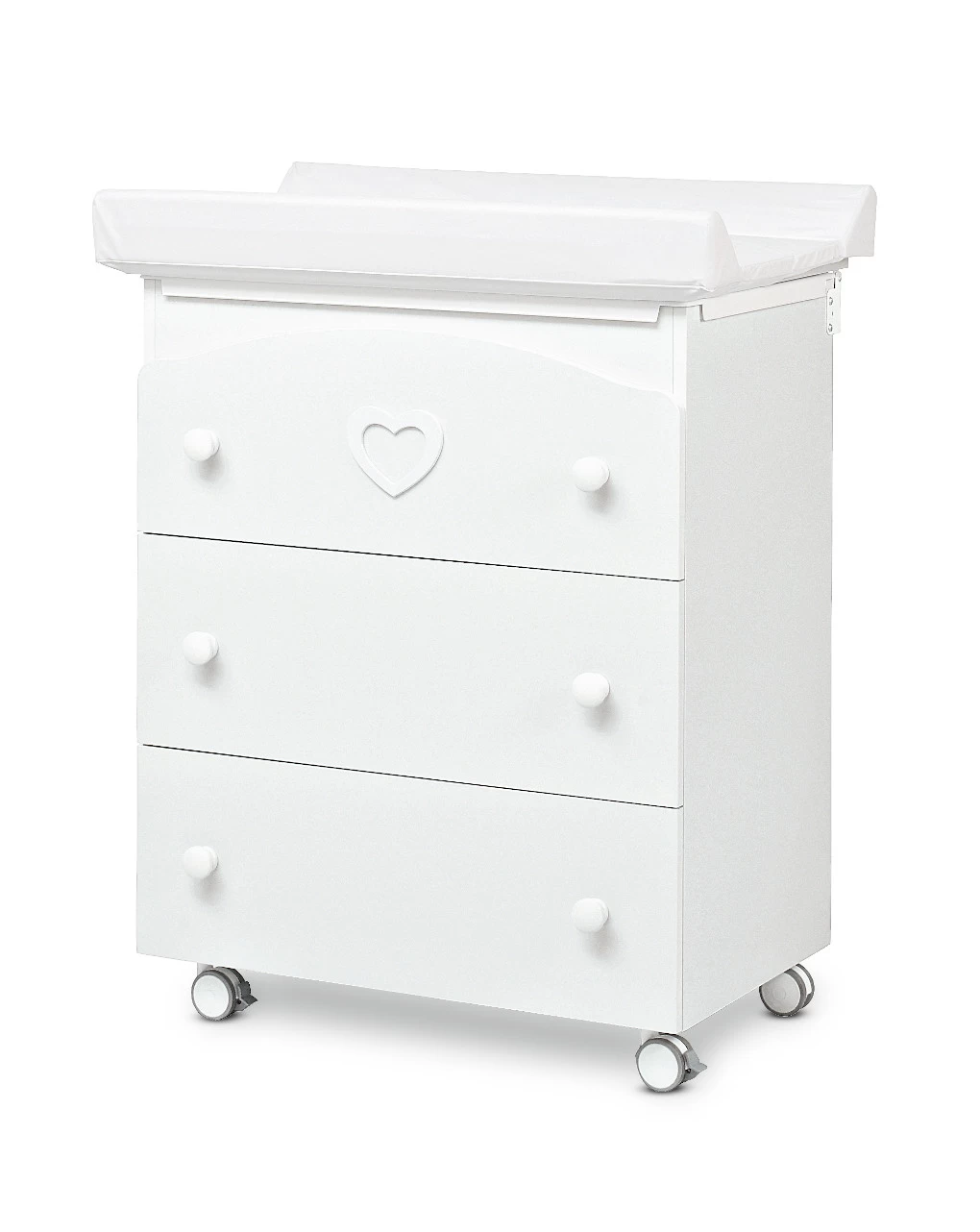 Cassettiera fasciatoio Dolce con struttura in truciolare certificato E1 a bassa emissione di formaldeide rivestito in PVC, dotata di vaschetta per il bagnetto anatomica e antiscivolo, maniglie in legno e 4 ruote di cui due con freno. Dimensioni: L81xP49xH100.5 cm.