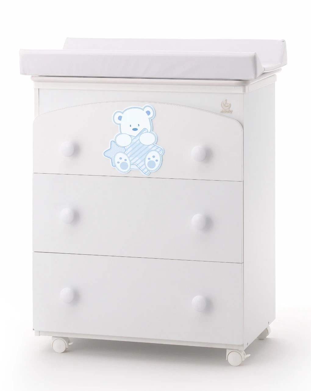 Cassettiera fasciatoio My Teddy realizzata con pannelli di truciolare nobilitato. Dotata di fasciatoio in pvc, vaschetta sagomata a doppia posizione con portasapone incorporato e cannuccia per lo svuotamento, 4 ruote piroettanti di cui 2 con freno.
