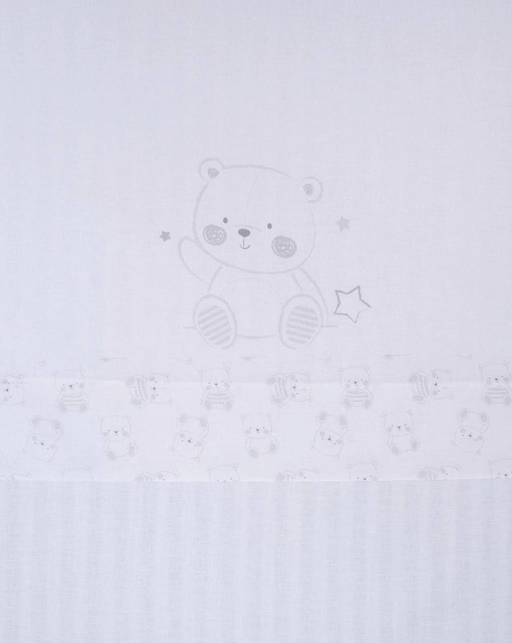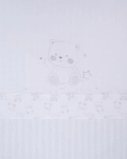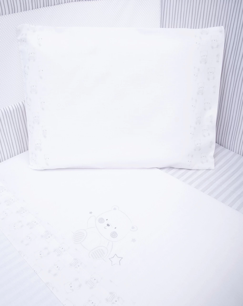Elegante completino culla/carrozzina realizzato in cotone bianco. Il set è composto da federa, lenzuolo sotto senza angoli e lenzuolo sopra. Il set è decorato dalla stampa d un simpatico orsetto che viene ripreso anche sulle bordure. Il set si compone di lenzuolo sotto 80×100 cm, lenzuolo sopra 80×100 cm e federa 26×30 cm.
