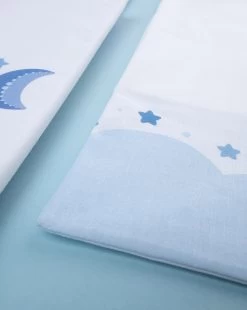 Tenero completo letto 3 pezzi da bambino in 100% cotone. I capi si presentano in colorazione bianca e varie tonalità di azzurro più stampa “Buonanotte”. Il completo letto da bimbo è pratico e maneggevole. Accessori non in vendita. La confezione contiene solo il capo d’abbigliamento.