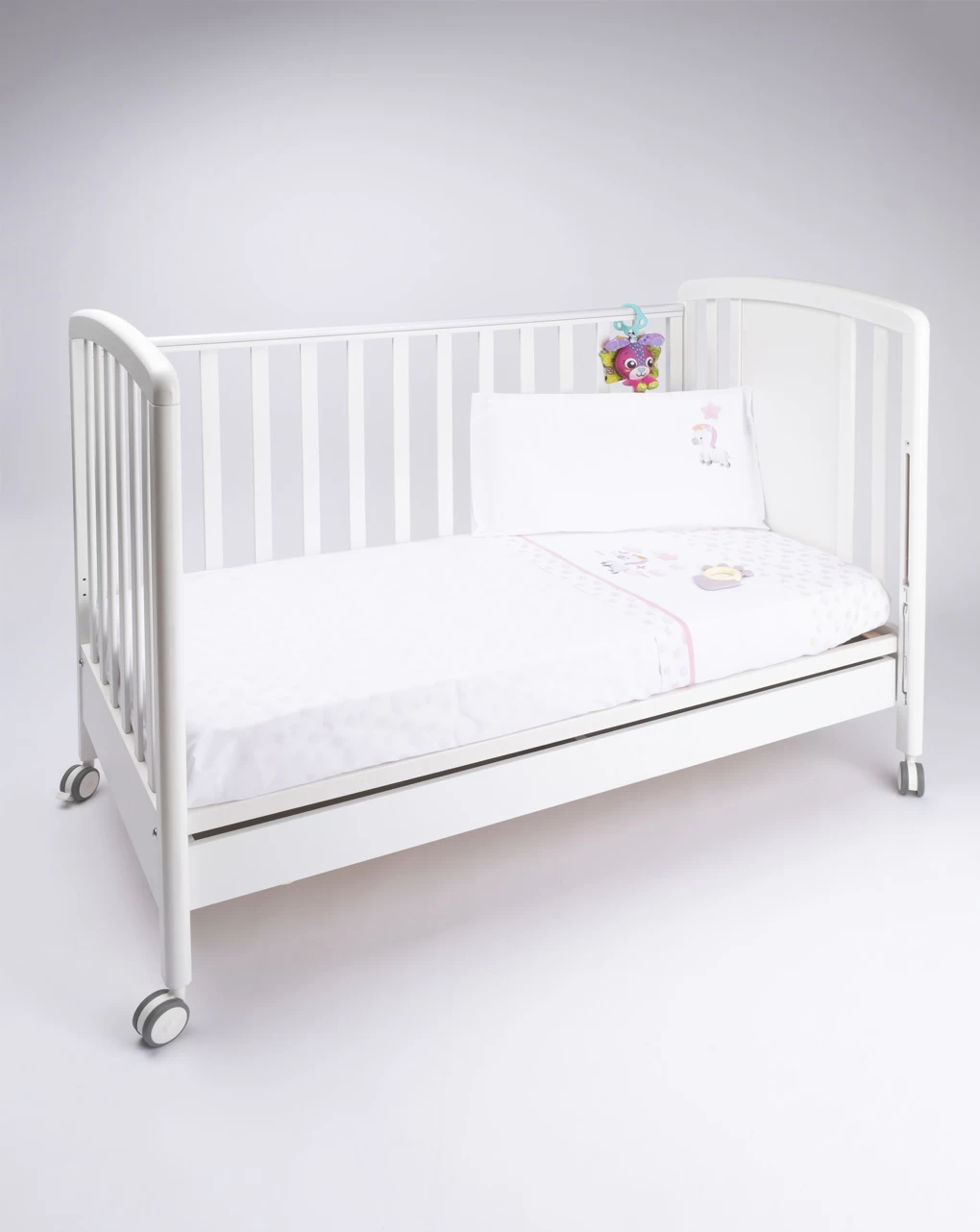 Completo 3 pezzi da bambina in 100% cotone adatto per lettini. Si compone di: federa 35×60 cm, lenzuolo sotto con angoli 60x 135×20 cm, e lenzuolo 120×180 cm. Il completo si presenta su sfondo bianco con stampa allover di stelle in tonalità sfumate e delicata stampa di un cavallino sempre in colorazione tenue ma coordinata; presente anche scritta “Sweet Dream”. Il set 3 pezzi è delicato e maneggevole. Accessori non in vendita. La confezione contiene solo il capo d’abbigliamento