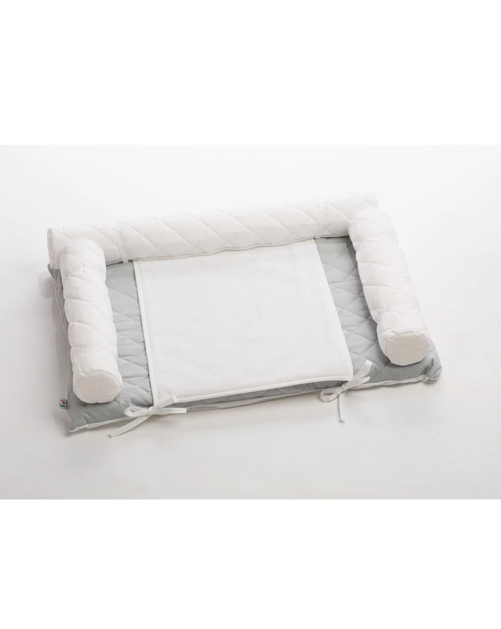 Fasciatoio tessile bianco e grigio con cilindri laterali, base sfoderabile, piano con filtrante salvapipì e morbida spugna 100% cotone.