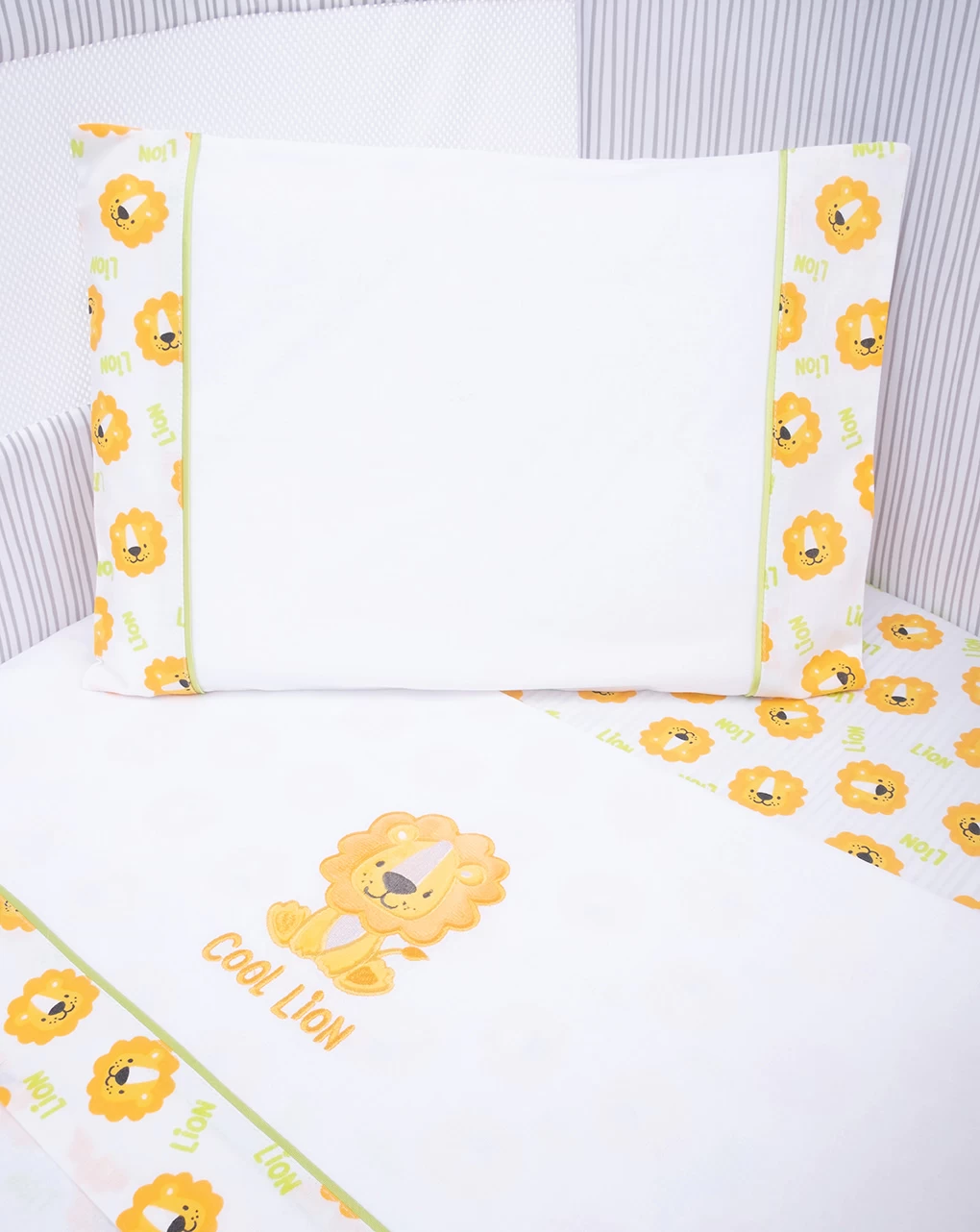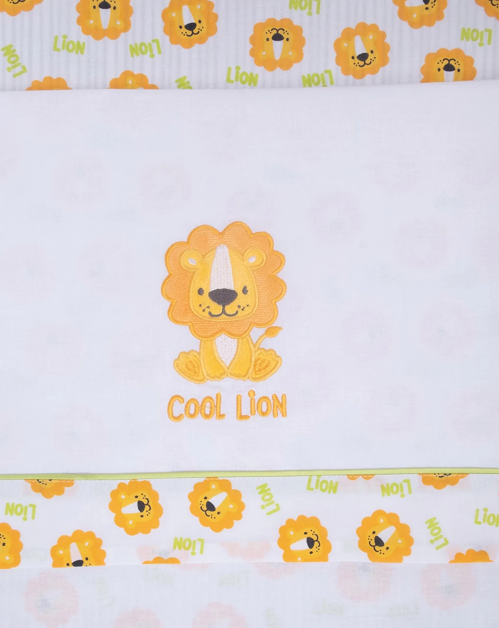 Tenero set composto da tre lenzuola. Il lenzuolino di sotto è decorato da una fantasia allover a tema leoncino, il secondo lenzuolino è bianco ed è decorato con una banda decorata da una fascia che riprende la fantasia e presenta un tenero leoncino frontale. La federa ha sui bordi una fascia uguale a quella presente sul secondo lenzuolino. Dimensioni: Lenzuolo sotto cm 80*110 cm Lenzuolo sopra cm 80*110 cm Federa 26*36 cm