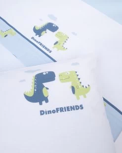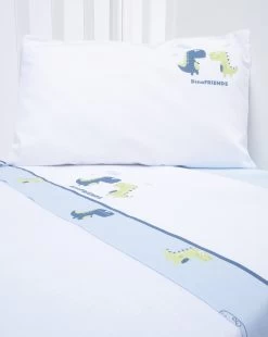 Tenero set letto composto da tre pezzi. Il lenzuolino sotto è in tinta unita azzurra, quello superiore è bianco ed è decorato con la stampa di un simpatico dinosauro. La federa, sempre bianca, riporta lo stesso decoro del secondo lenzuolino. Dimensioni: Lenzuolo sotto 120*180 cm Lenzuolo sopra 60*135*20 cm Federa 35*60 cm