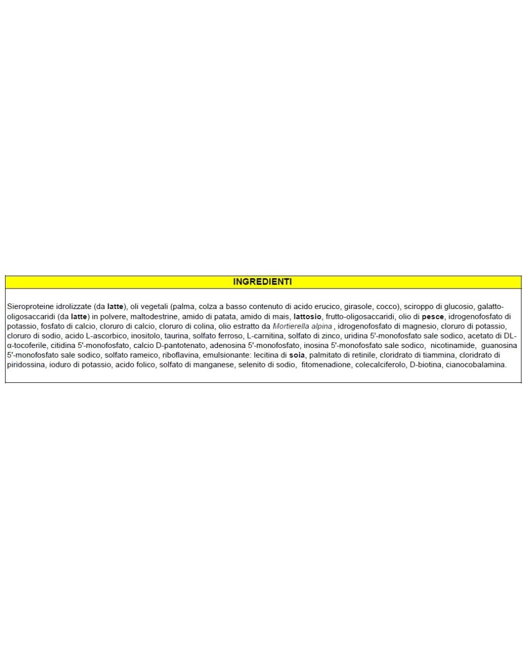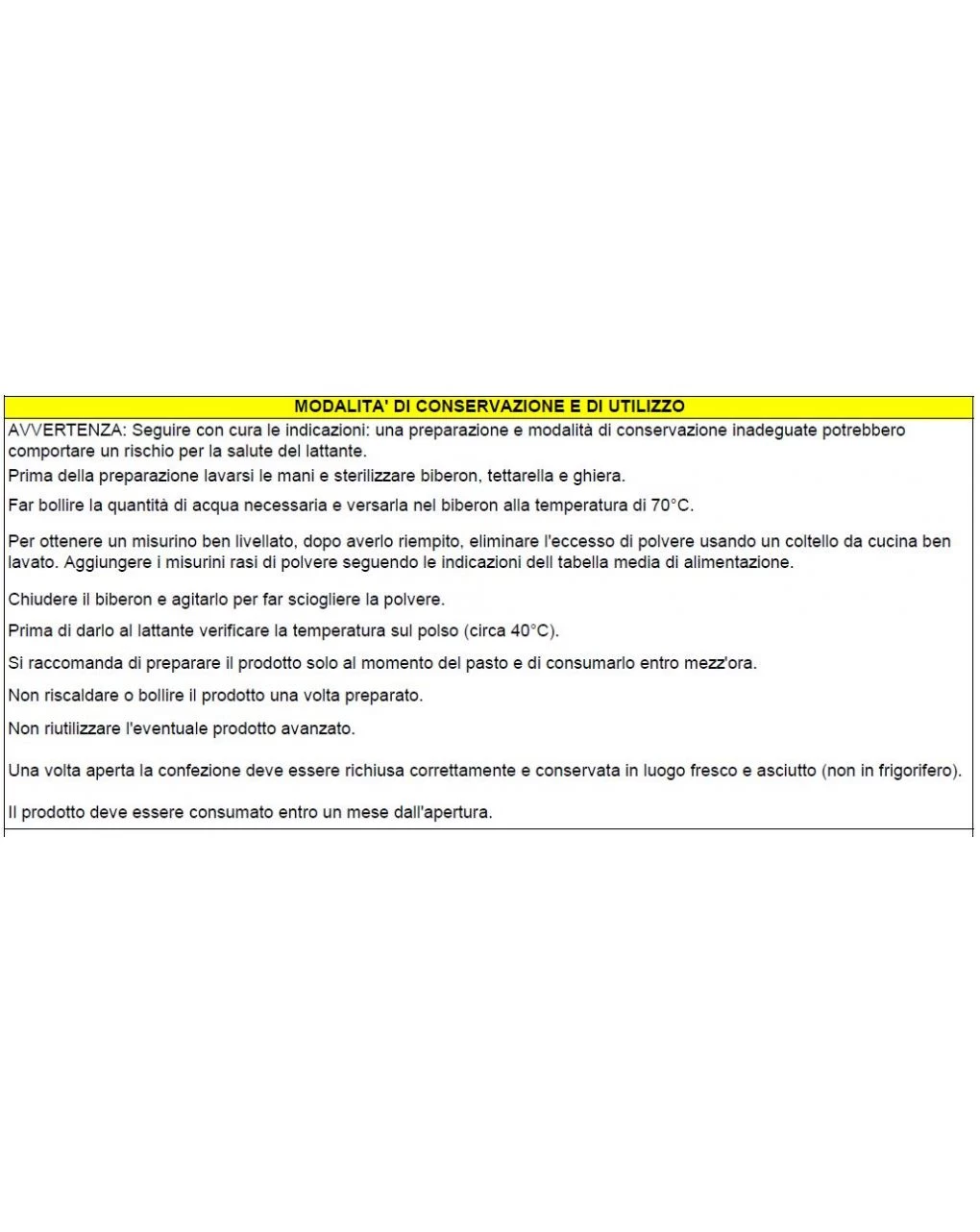 Il prodotto deve essere utilizzato sotto il controllo del Pediatra ed è indicato per lattanti. Il prodotto non deve essere utilizzato come unica fonte di nutrimento nei primi sei mesi di vita. Il prodotto non deve essere utilizzato per via parenterale. Importante: Il latte materno è l’alimento ideale per il lattante. E’ raccomandato come alimento esclusivo fino al sesto mese e come componente lattea di una dieta equilibrata durante lo svezzamento e anche dopo l’anno di vita.