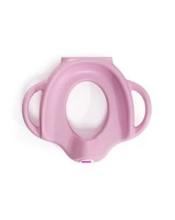 Pratico riduttore wc, con schienale alto e maniglie per un comodo appoggio del bimbo. Bordo antiscivolo per una perfetta aderenza al wc .