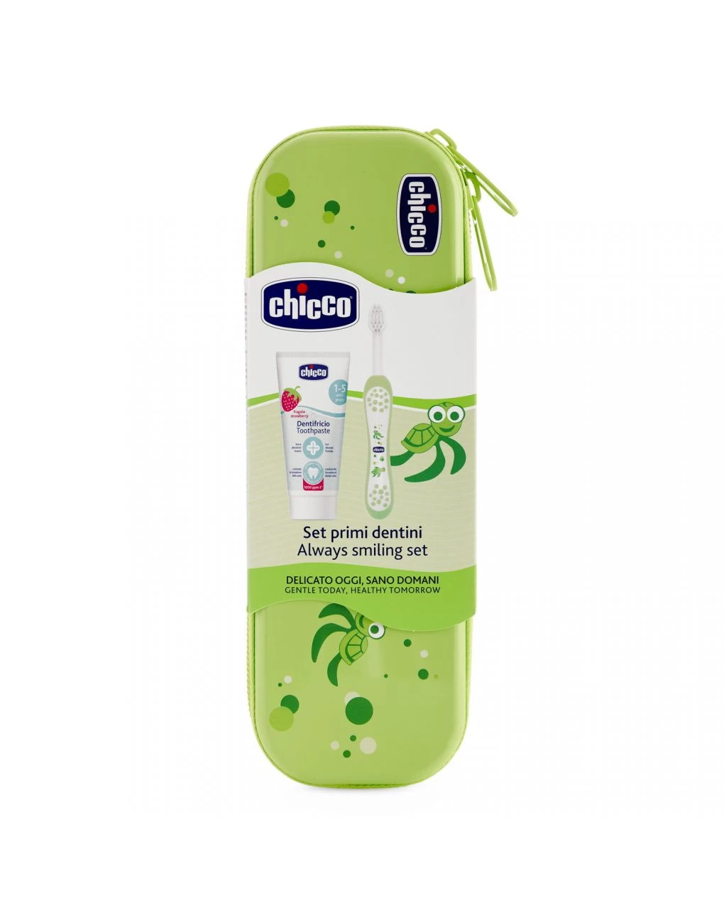 Il set sempre sorridenti insegna al tuo bambino a prendersi cura dei suoi dentini. Il pratico e divertente astuccio contiene uno spazzolino 12m+ con copri setole ed un dentifricio alla fragola.