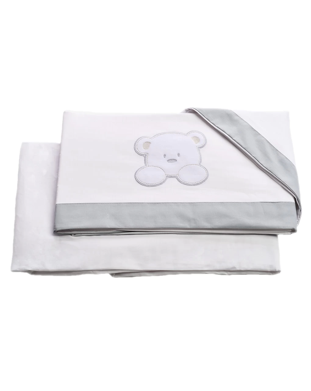 Completo in cotone per culla e carrozzina composto da tre pezzi: federa cm 26×35, lenzuolo sotto senza angoli cm 80×110 e lenzuolo sopra cm 80×110.
