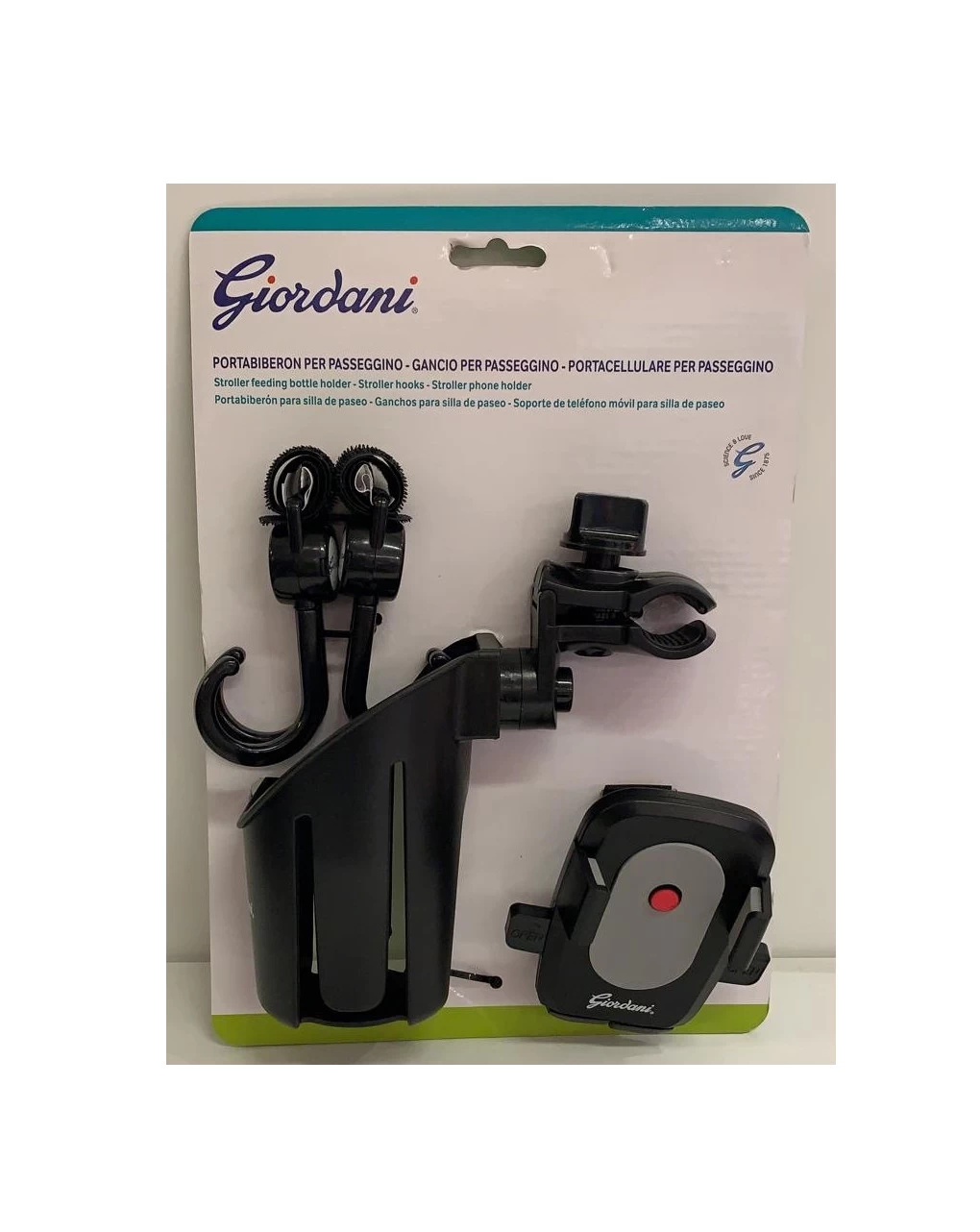 Comodo kit per i tuoi spostamenti con il tuo bambino: portabiberon per passeggino, gancio per passeggino e portacellulare.