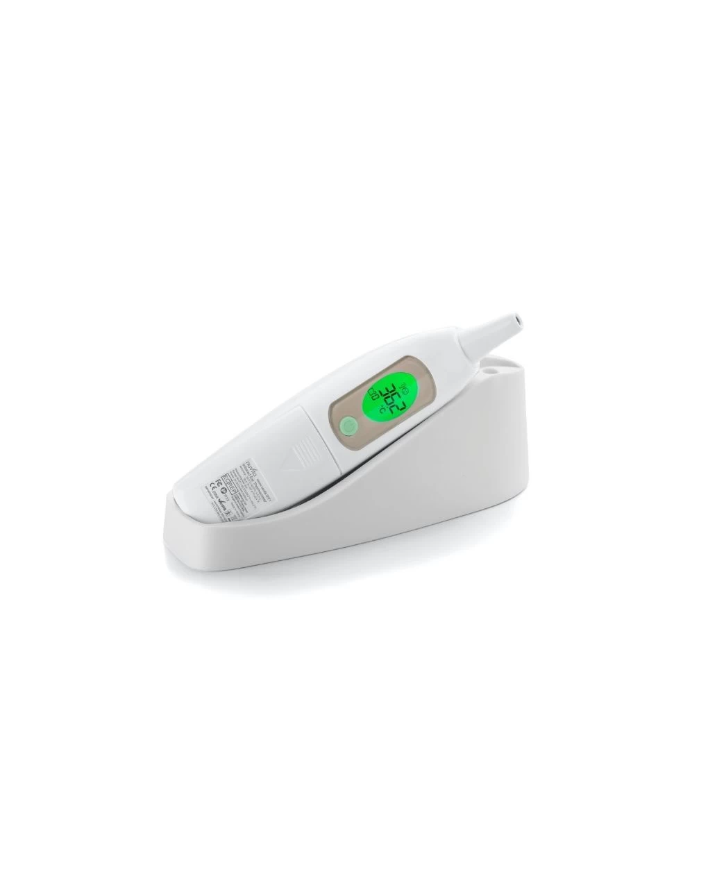 Veloce pratico ed accurato misura la temperatura auricolare. Il display retroilluminato cambia colore a seconda della temperatura rilevata ed un segnale acustico avvisa in caso di febbre oltre i 38°. Tiene memoria delle ultime 10 misurazioni.