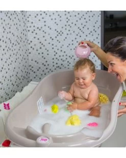 La vasca Onda di Ok Baby è dotata di tre punti d’appoggio: due ascellari e uno inguinale. Termometro digitale incorporato. Può essere fissata alla vasca da bagno della casa.